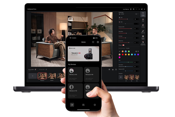 Connect your phone or PC to the same Wi-Fi network as the VenusLiv Air for full-access to your live feed and control over your device. The VenusCam mobile app facilitates real-time camera monitoring, recording, device control, scene adjustment, color tuning, and exposure lock, among other features. The Hollyland CAM PC software facilitates green screen, image overlay, skin beauty, real-time camera monitoring, recording, and device control of similar parameters.